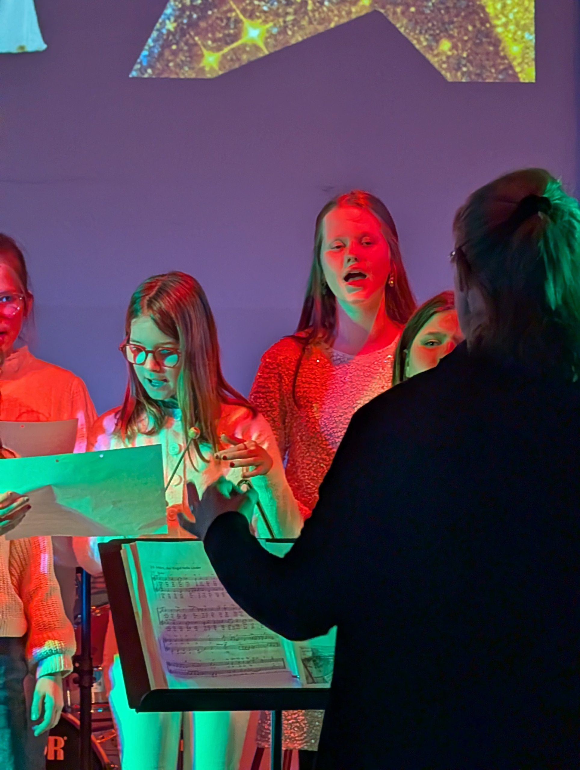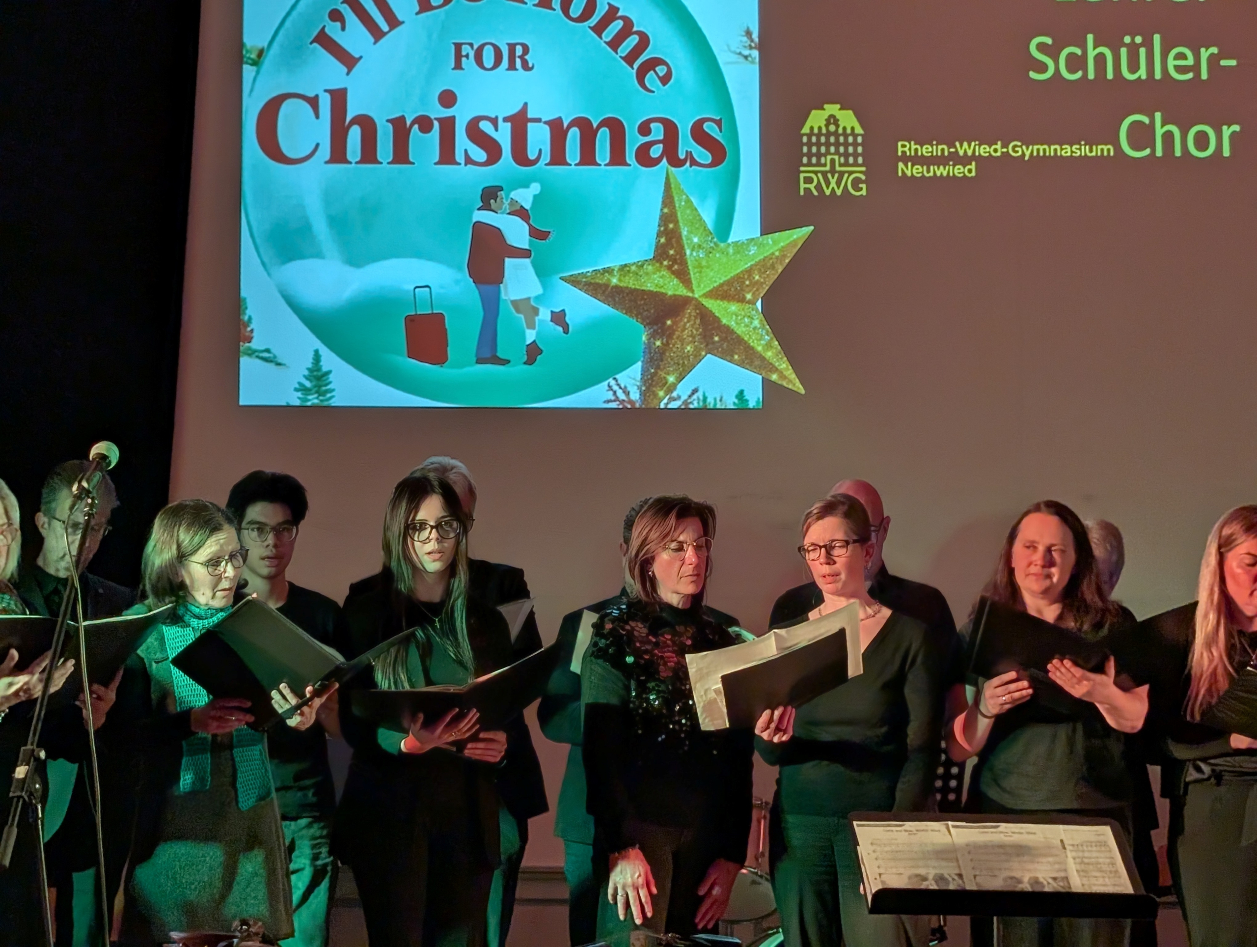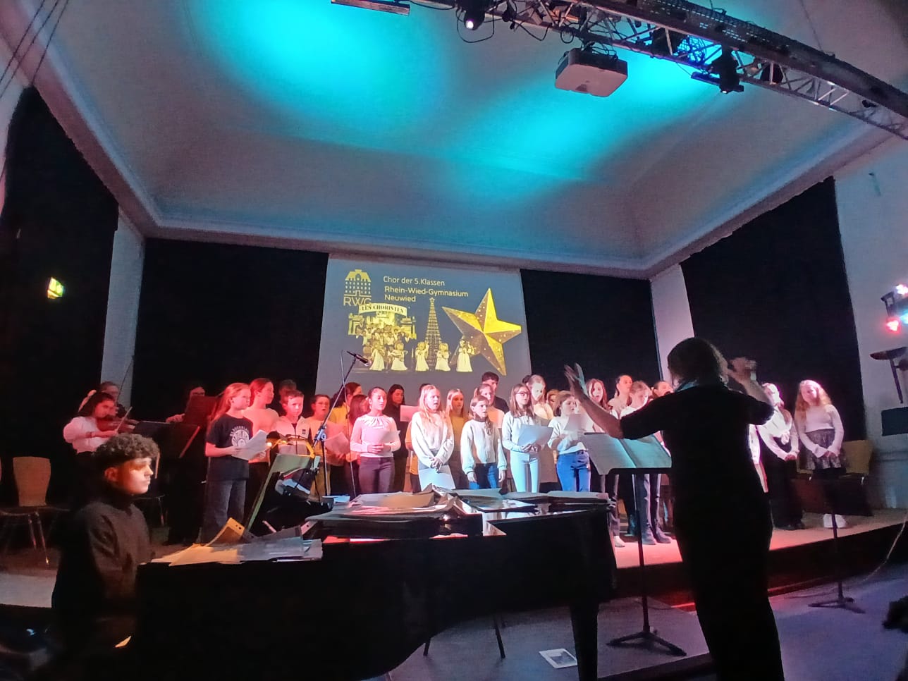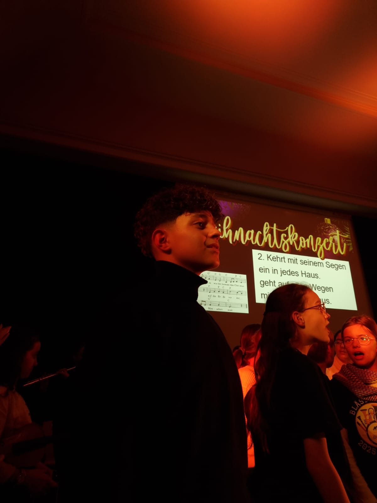 Den krönenden Abschluss bildete das gemeinsame Singen von „Alle Jahre wieder“, bei dem auch das Publikum herzlich eingeladen war, mitzusingen – ein bewegender Moment gelebter Schulgemeinschaft. Stimmungsvolle Hintergrundprojektionen von Jochen Settili sowie die souveräne Unterstützung der Technik-AG mit Adar Ekinci, Lukas Stanke, Oskar Gögler und Jochen Settili trugen wesentlich zum Gelingen des Abends bei. Auch das liebevoll gestaltete Werbeplakat von Beverley Bauer und Julia Hildebrandt sei an dieser Stelle gewürdigt.