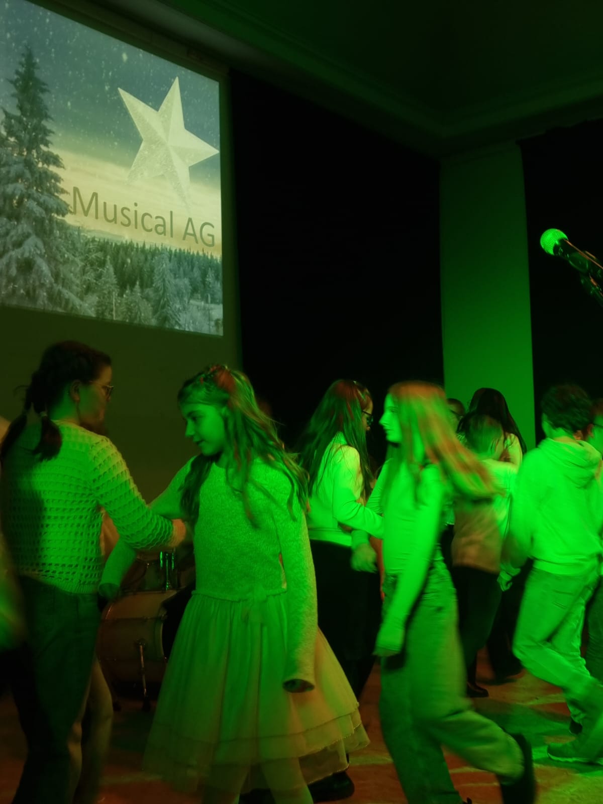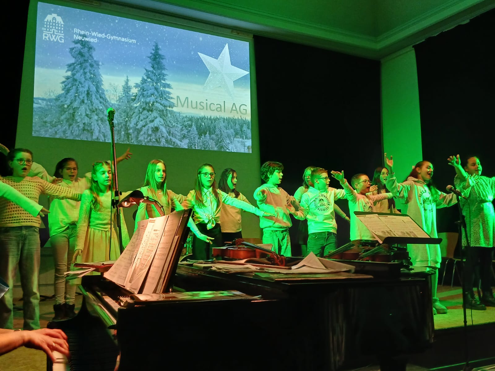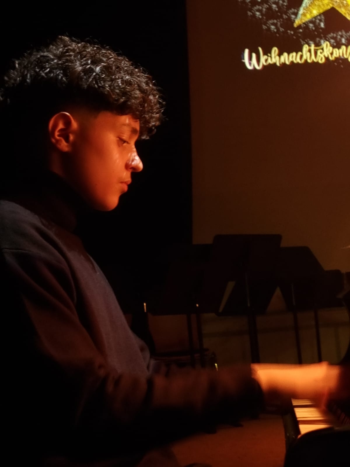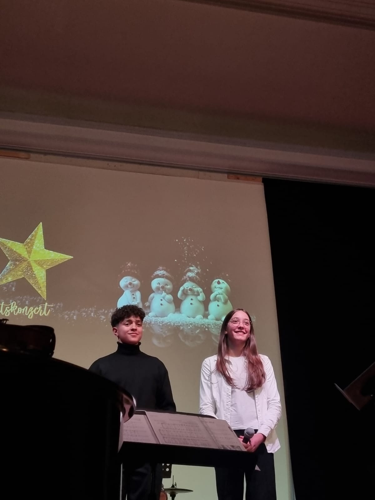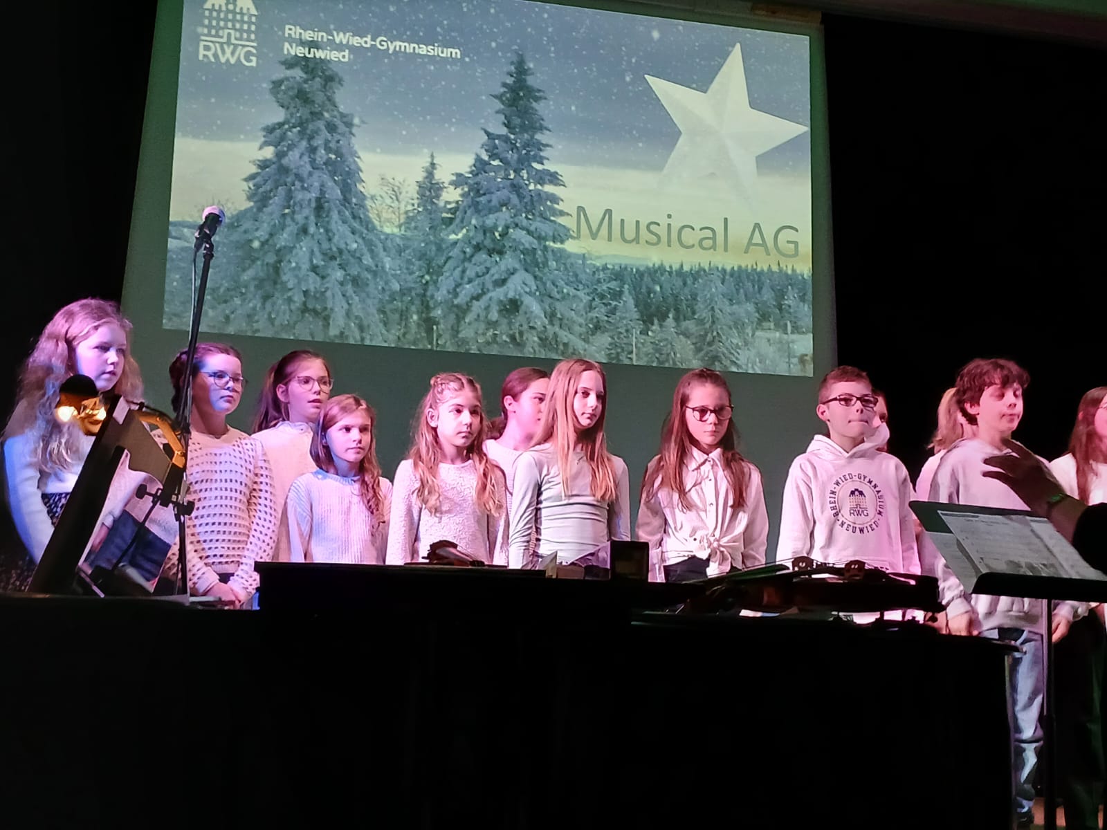 Den krönenden Abschluss bildete das gemeinsame Singen von „Alle Jahre wieder“, bei dem auch das Publikum herzlich eingeladen war, mitzusingen – ein bewegender Moment gelebter Schulgemeinschaft. Stimmungsvolle Hintergrundprojektionen von Jochen Settili sowie die souveräne Unterstützung der Technik-AG mit Adar Ekinci, Lukas Stanke, Oskar Gögler und Jochen Settili trugen wesentlich zum Gelingen des Abends bei. Auch das liebevoll gestaltete Werbeplakat von Beverley Bauer und Julia Hildebrandt sei an dieser Stelle gewürdigt.