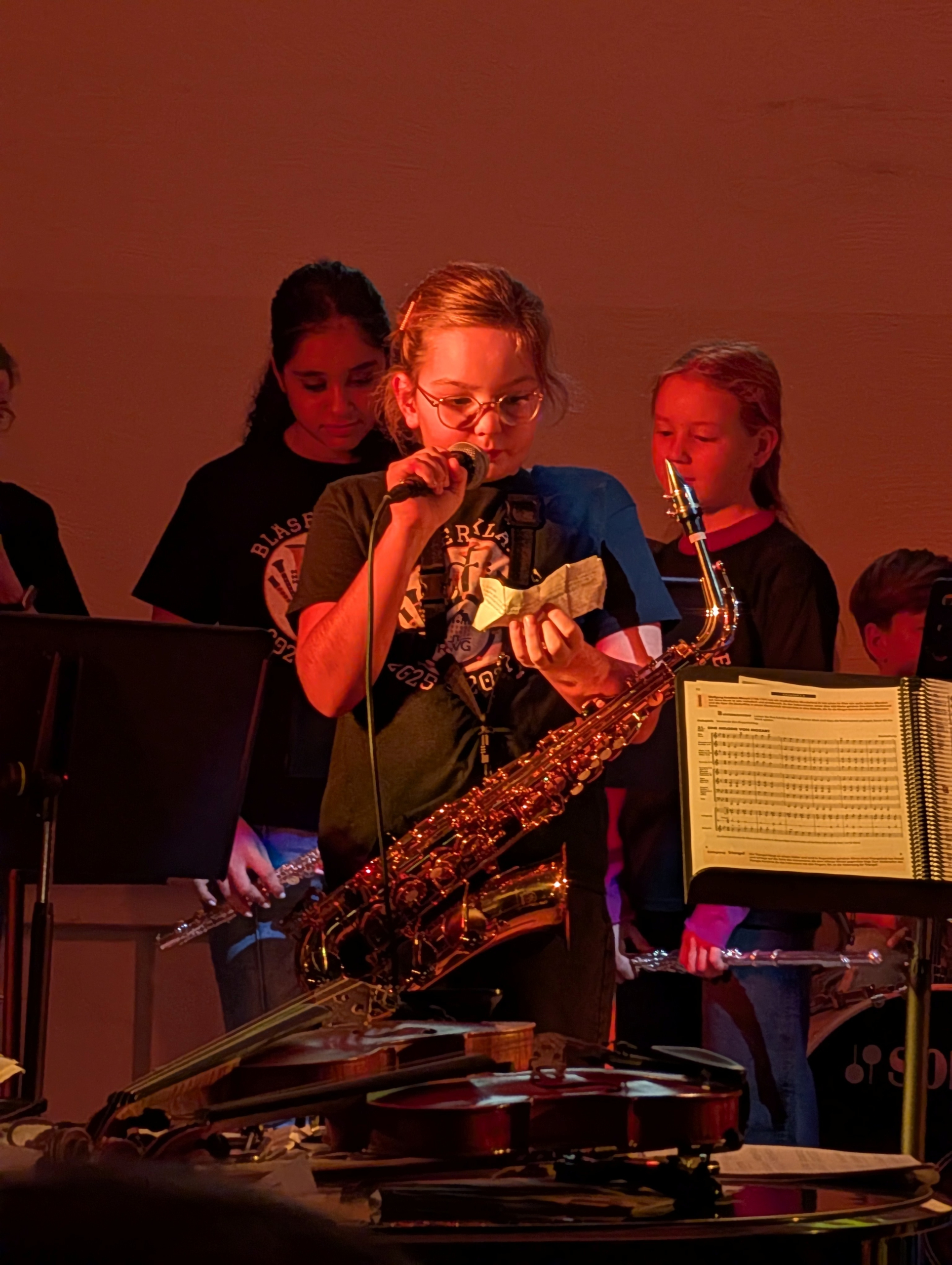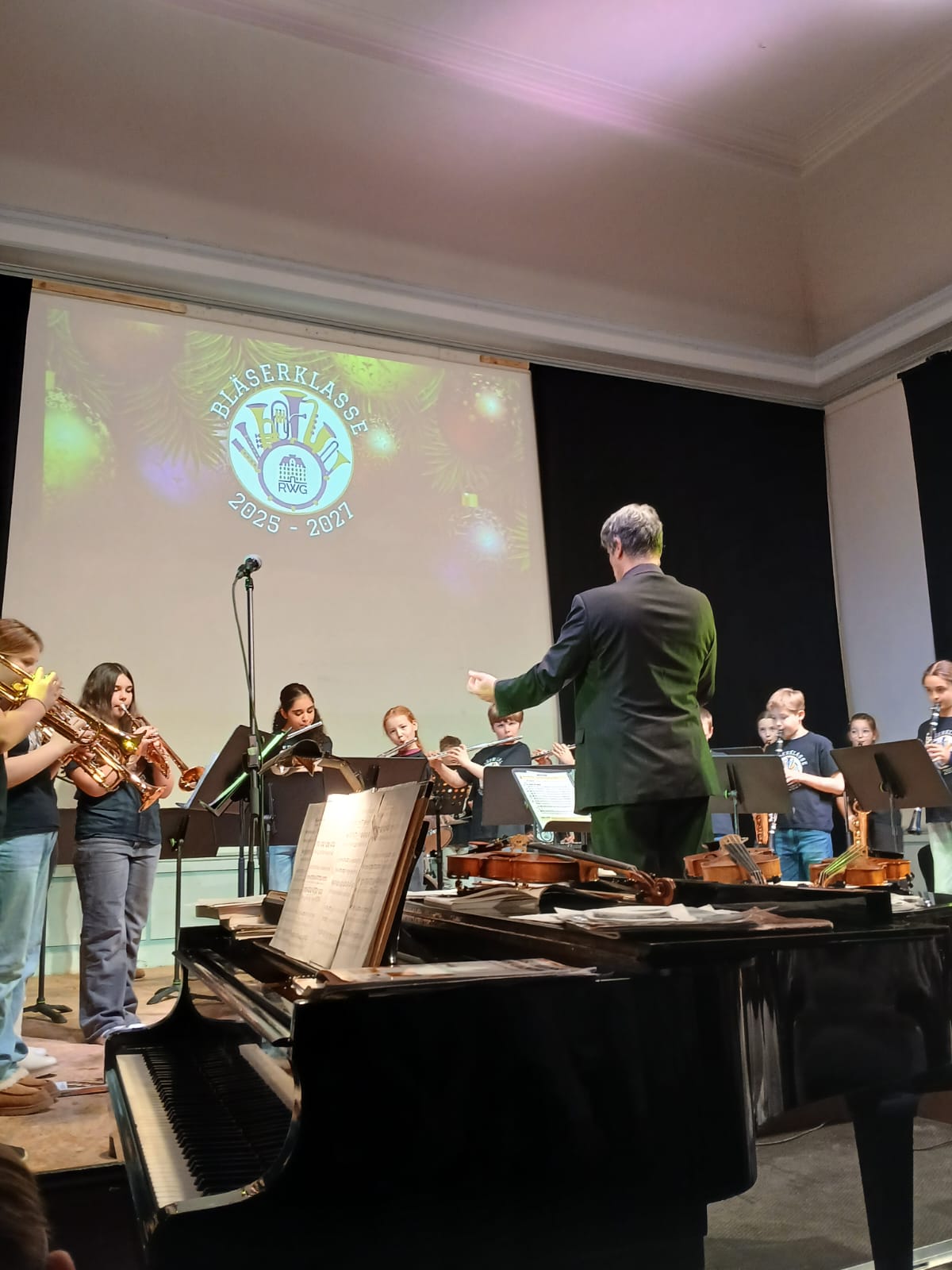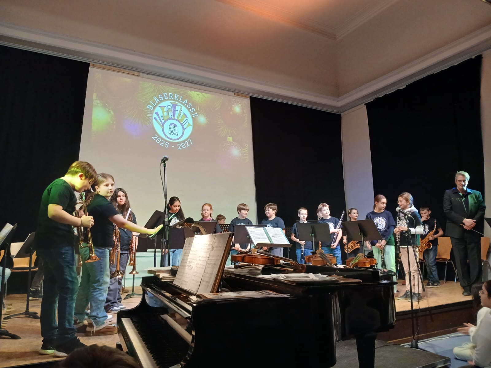 Den Auftakt gestaltete die Klasse 5b als erste Bläserklasse unseres Gymnasiums unter der Leitung von Alexander Reffgen. Mit Werken wie „Eine Melodie von Mozart“, „Ode an die Freude“, „Bruder Jakob“ und „Jingle Bells“ zeigten die jungen Musikerinnen und Musiker schon nach nur einem halben Jahr Unterricht eindrucksvoll, mit wie viel Begeisterung und Können sie bereits musizieren. Ein besonderer Moment war das gefühlvolle Solo von Karolina Hartleif, begleitet am Klavier von Haidar Fadel, mit „Snowman“ – ein Beitrag, der das Publikum sichtlich berührte.