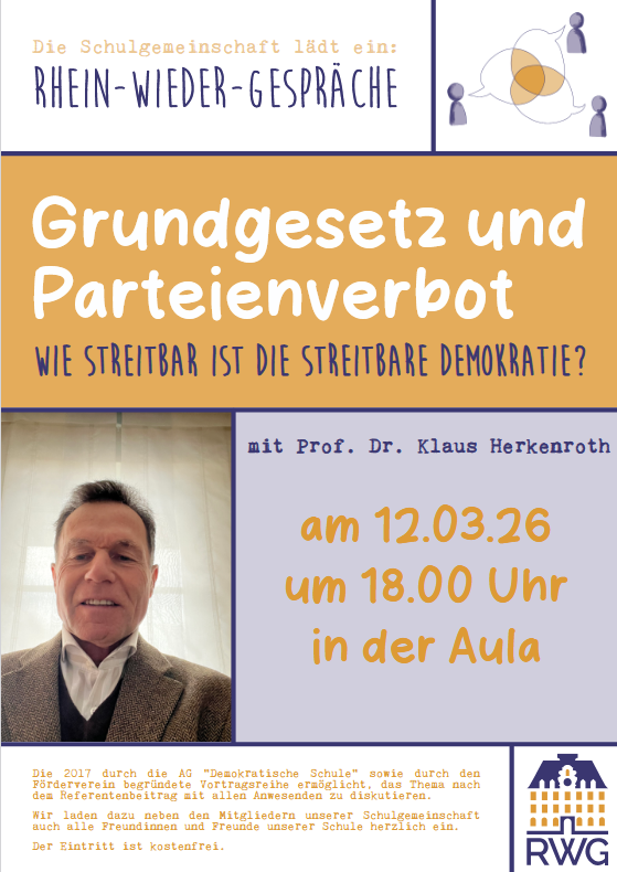 Im Rahmen unseres Jubiläumsjahres lädt das RWG zu einer besonderen Ausgabe der Rhein-Wieder-Gespräche ein. Die traditionsreiche Vortragsreihe bietet Raum für Austausch, Diskussion und gesellschaftliche Orientierung – offen für unsere Schülerinnen und Schüler, Eltern, Ehemalige sowie alle Interessierten aus der Region.