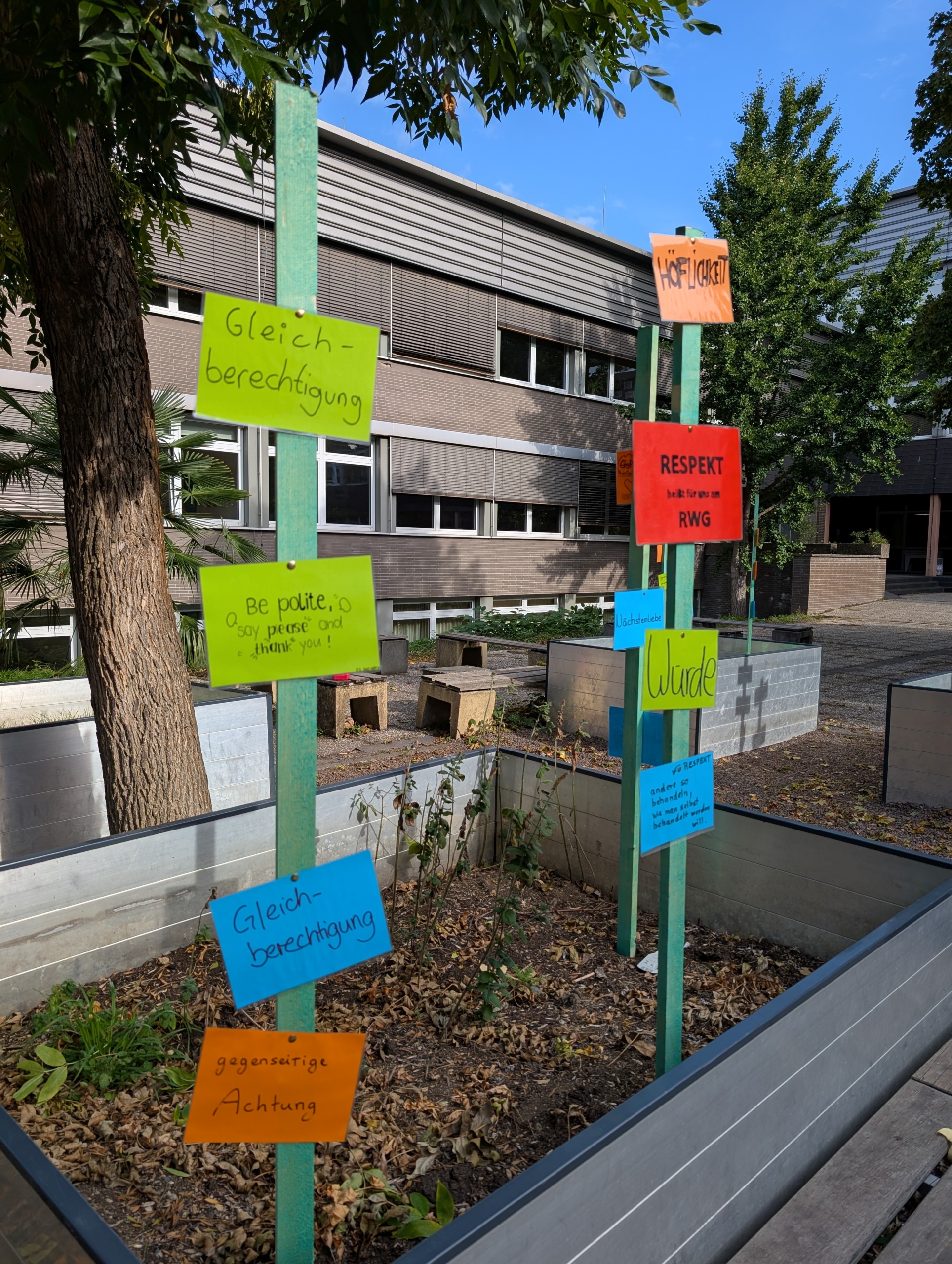 Wir, als Rhein-Wied-Gymnasium, sehen uns zunehmend gefordert, neben Bildungs- auch Wertearbeit zu leisten. So haben sich unsere Klassen am Montag in der ersten Stunde mit der Tugend Respekt auseinandergesetzt und ihre Definition auf laminierte Karten geschrieben, vorbereitet von Annika Wickert, die Clemens Deppe für den Arbeitskreis „RWG mit ❤️“ im Innenhof auf Holzstelen ausgestellt hat.